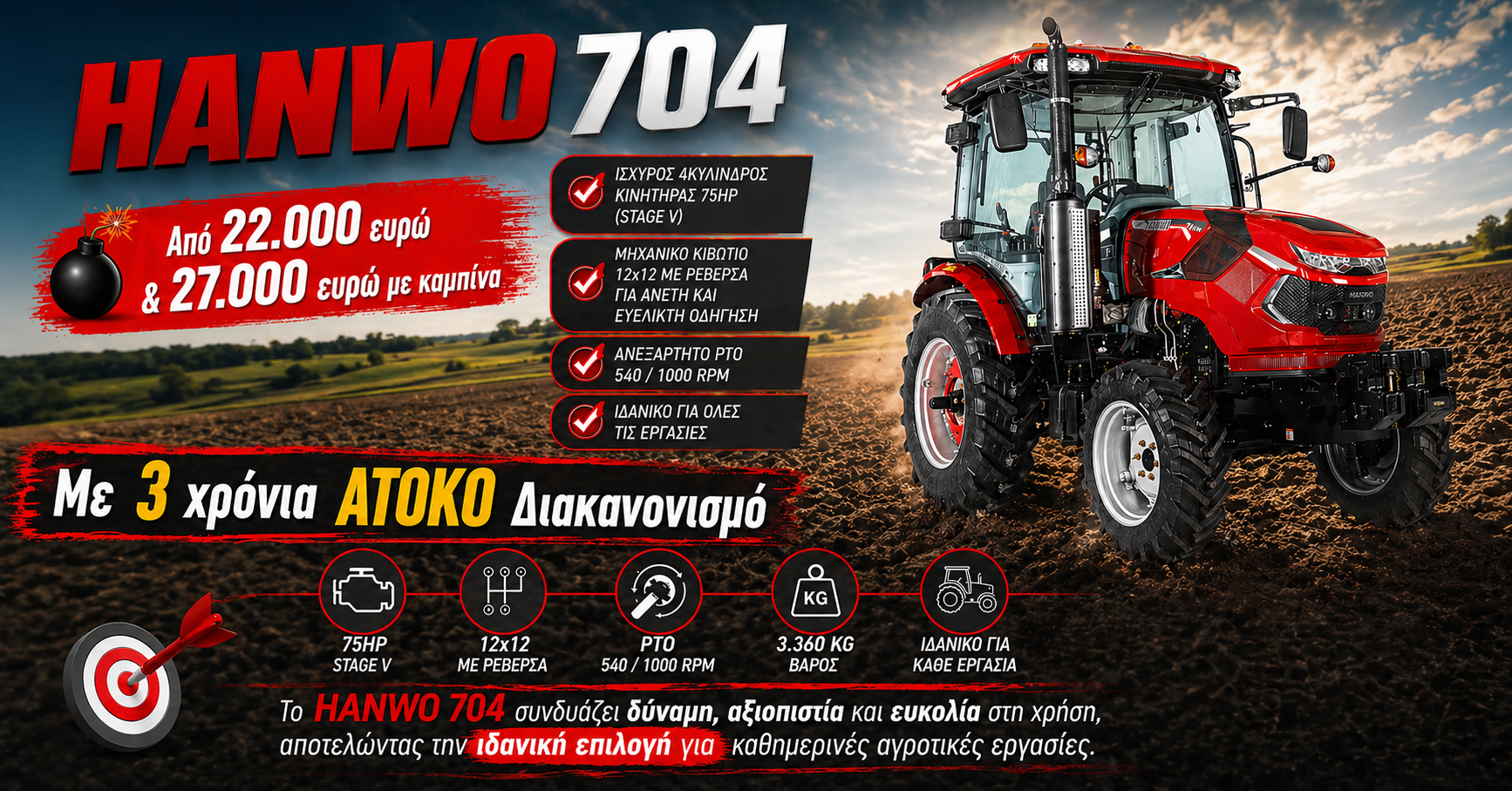 0 5– ΧΑΡΑΚΤΗΡΙΣΤΙΚA : Ημι-στάνταρ τρακτέρ -Στοιχεία Κινητήρα: 4 κύλινδρος ,2500 κ.εκ. , 75ίπποι -Ρεβέρσα : Hλεκτρουδραυλική – Συμπλέκτη στο…